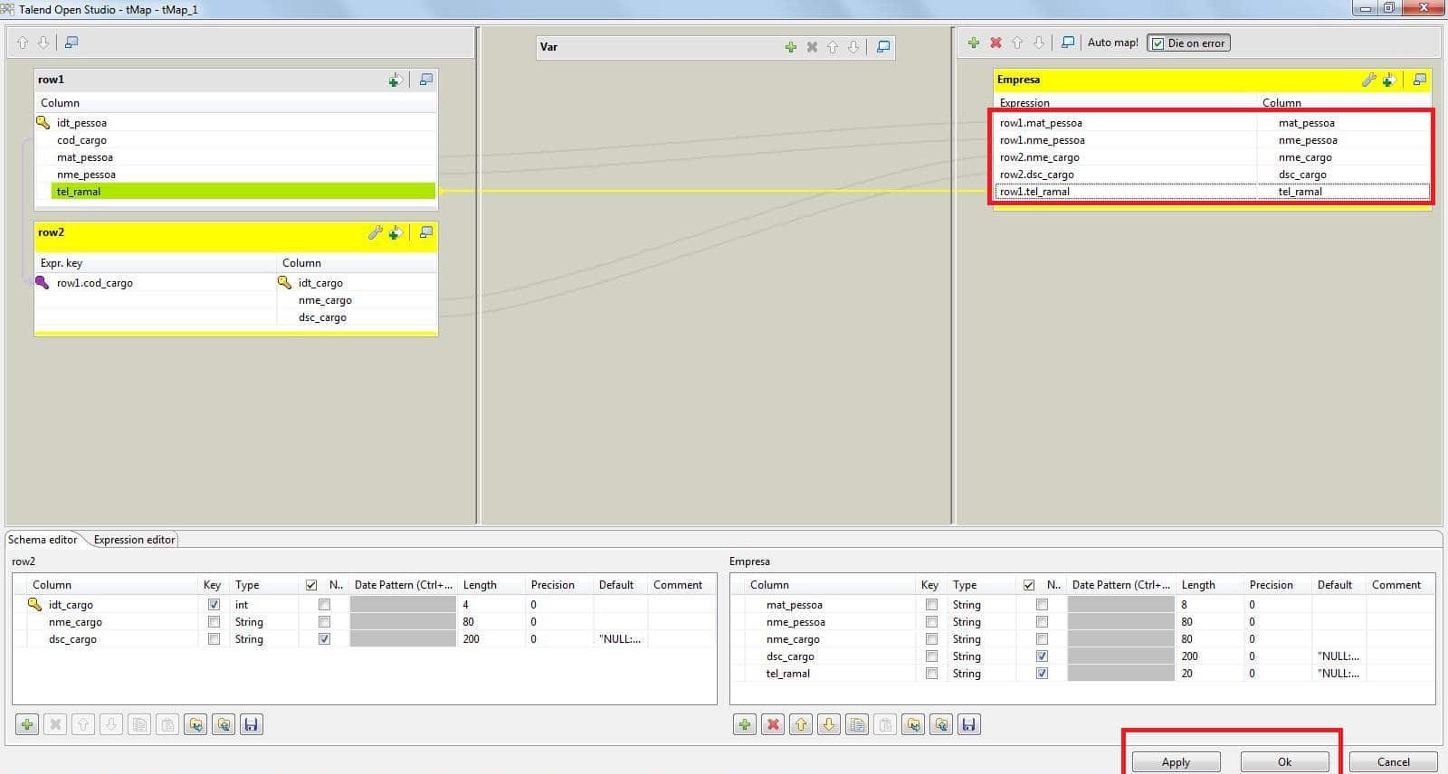 • Clique nas colunas das tabelas de origem e arraste para a saída criada. Arrate apenas os seguintes campos: mat_pessoa, nme_pessoa, nme_cargo, dsc_cargo e tel_ramal.